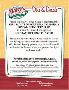 Take a break from the kitchen and enjoy a delicious meal from Mary’s Pizza Shack. Monday, Oct. 17th is Dine & Donate night, where 20% of your purchase will be donated back to the Sonoma Girl Scouts! Offer is good for take-out or dine-in meals, and valid at both Mary’s locations.